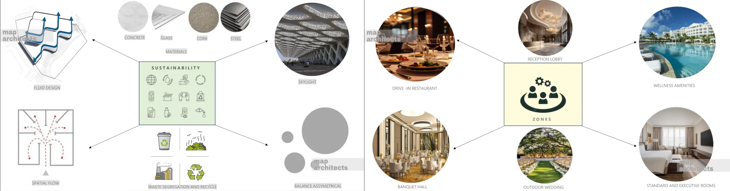 The concept centered on fluid design and spatial flow, utilizing an asymmetrical balance within the broader Architectural Concept Design framework. Key zones included a drive-in restaurant, reception lobby, and wellness amenities. Functional spaces transitioned from a banquet hall and outdoor wedding lawn to standard and executive rooms, supported by active waste segregation and recycling, structured through effective architectural zoning for hospitality projects.
