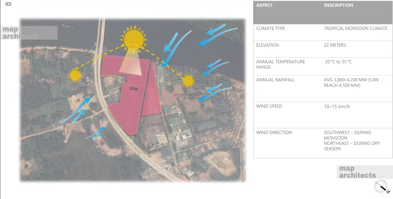 MAP Architects’ site review identified primary and secondary views to maximize aesthetic value as part of the architectural site analysis for hotels. Technical factors included observation and review of road widths, elevation, and climate data—specifically temperature fluctuations, rainfall patterns, and wind speed/direction—that dictated the building’s orientation for natural ventilation, reinforcing principles of climate responsive hospitality architecture and Sustainable Architecture Design.
