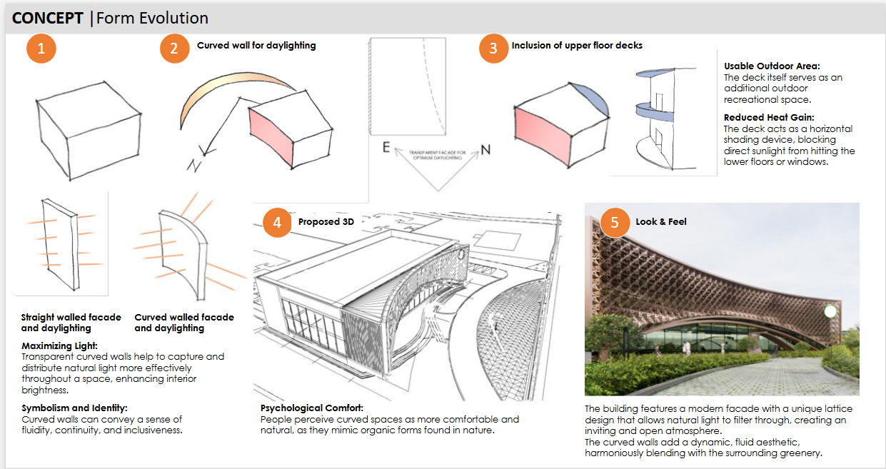 Integrating the sun path data and wind travel vectors into an algorithmic software for architectural output, MAP Architects sculpted the building’s massing to channel cooling breeze, reduce structural strain and pedestrian discomfort. The results were nothing less than stunning. Curved fluid aesthetic walls harmonically blended with surrounding greenery, mimicking natural organic forms. The outdoor deck area served as a horizontal shading device, blocking direct sunlight from hitting the lower floors or windows.